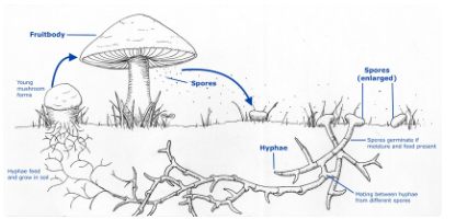 Fungi has specialized feathery filaments called Hyphae. They grow from a point and extend out in search of food. Hyphae can also branch out and create a large network called a mycelium. The fruiting body is made to generate and disperse spore into the surroundings to grow more fungi.
